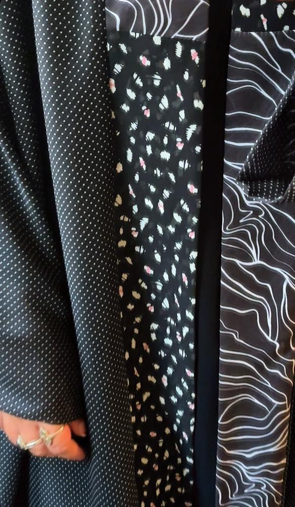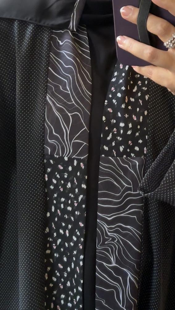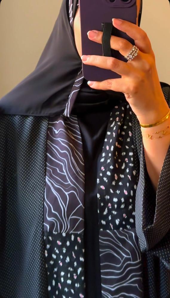 القماش : شيفون مشجر ثلاث نقشات بالعباية ، مبطنة العباية ليزر اسود