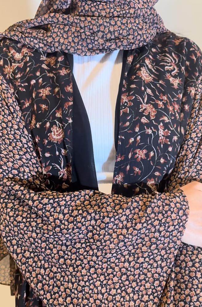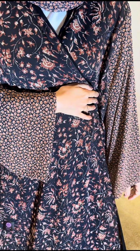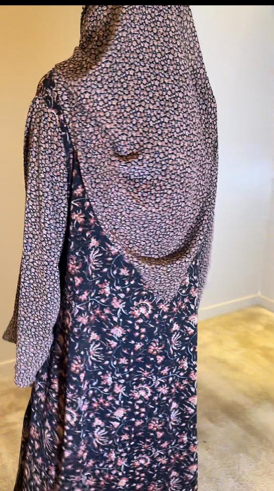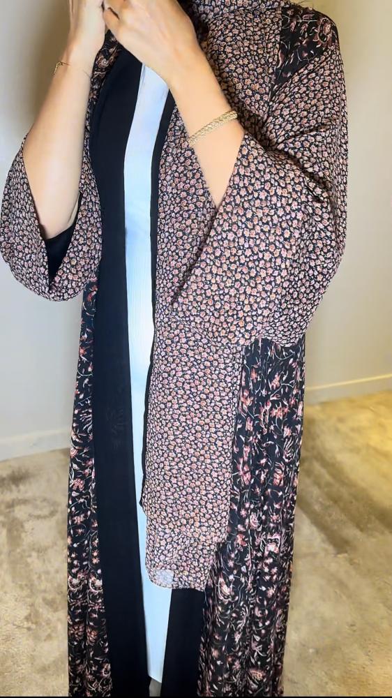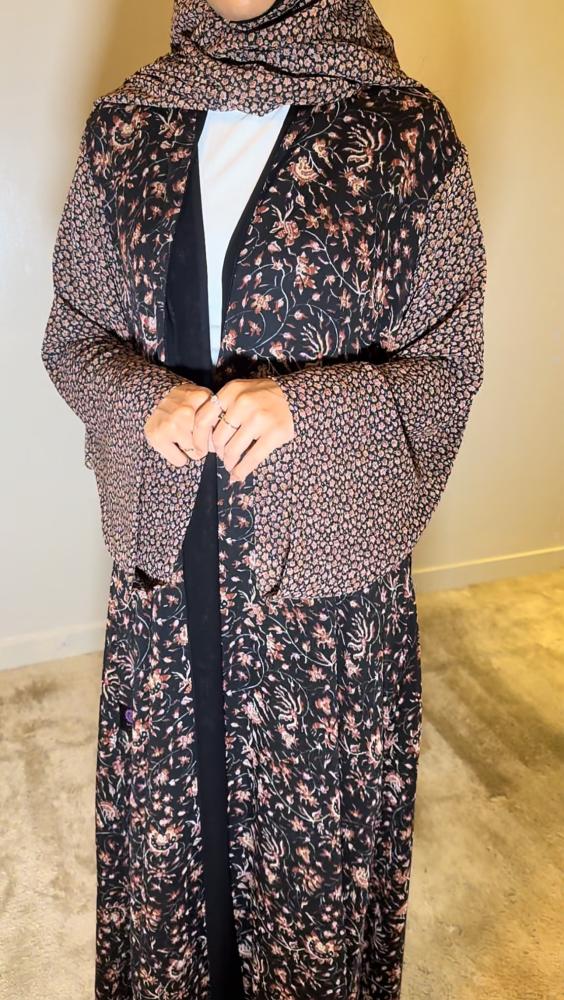 يتوفر مع العباية طرحتين، طرحة مشجر بطرف اسود ، والعكس طرحة اسود بطرف مشجر .