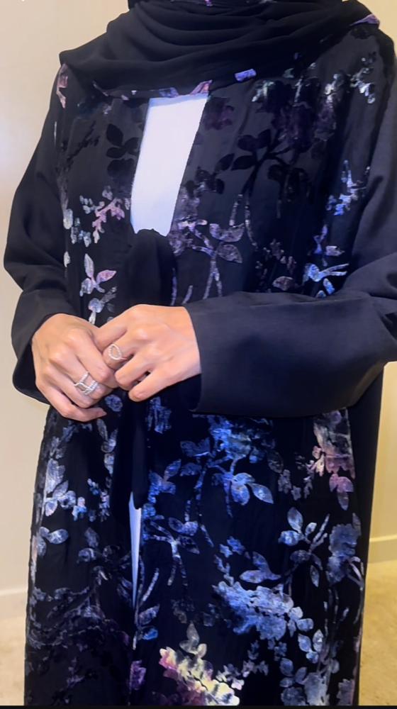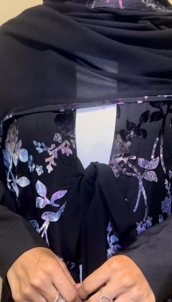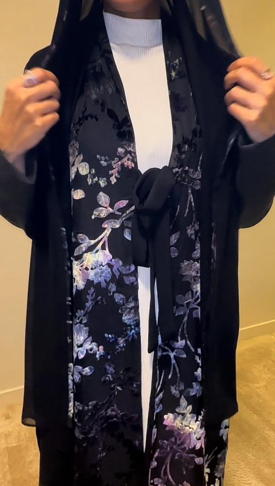 عباية من الامام مخمل على شيفون مشجر مبطن بكريب ناعم ومن الخلف والاكمام كتان اسود