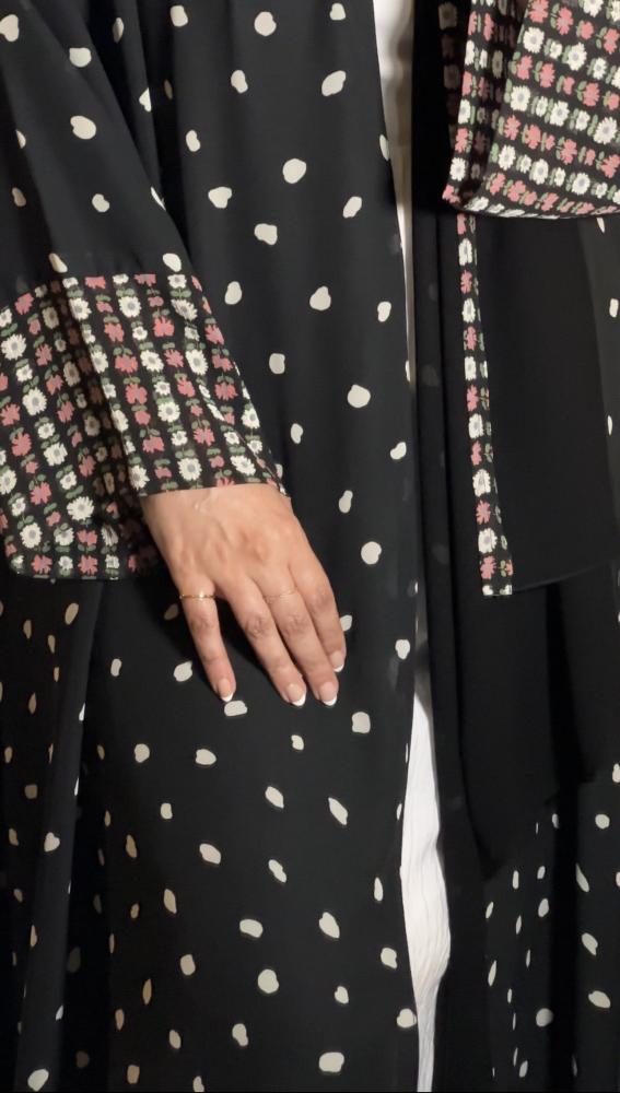 القماش : شيفون كوري اسود منقط مع طرف كم شيفون كوري مورد مبطنة العباية ليزر .
