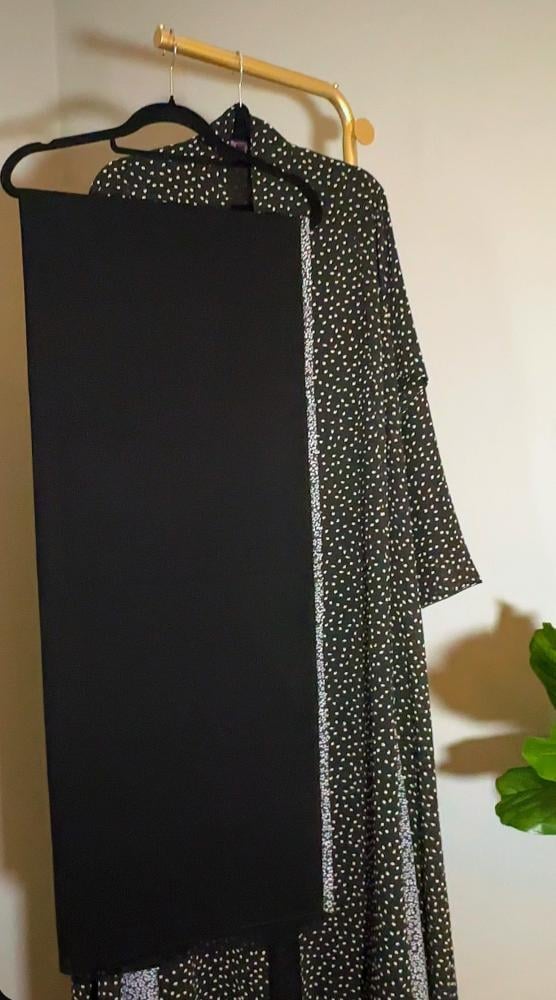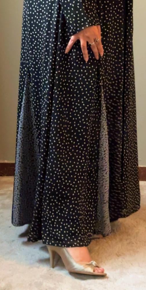 القماش : شيفون كوري مشجر اسود وابيض مع كسرات من الامام والخلف بقماش شيفون مشجر بنقشة اخرى ، مبطنة العباية ليزر اسود