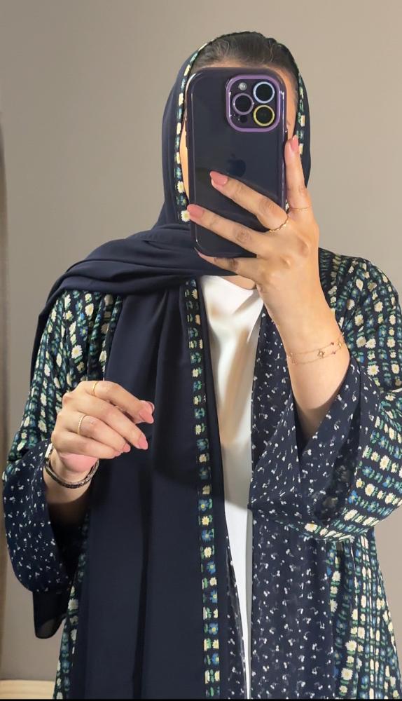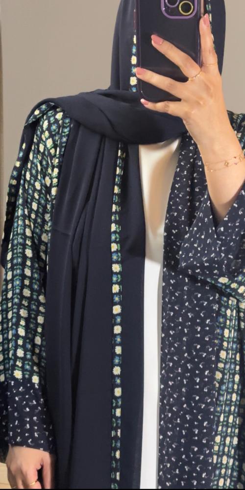 القماش : شيفون كوري مشجر بلون كحلي وتركواز وياقة وطرف كم شيفون مبطنة العباية لبزر كحلي