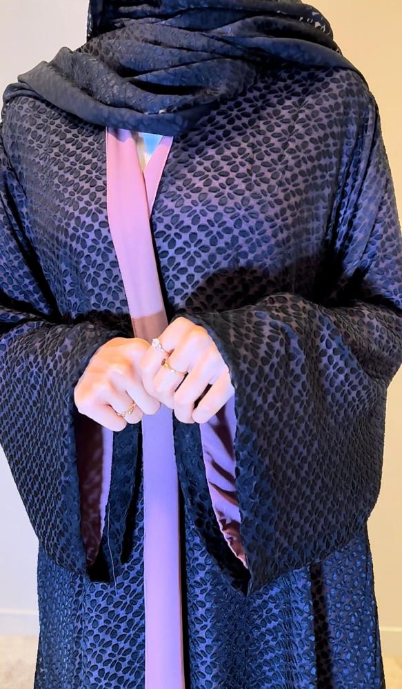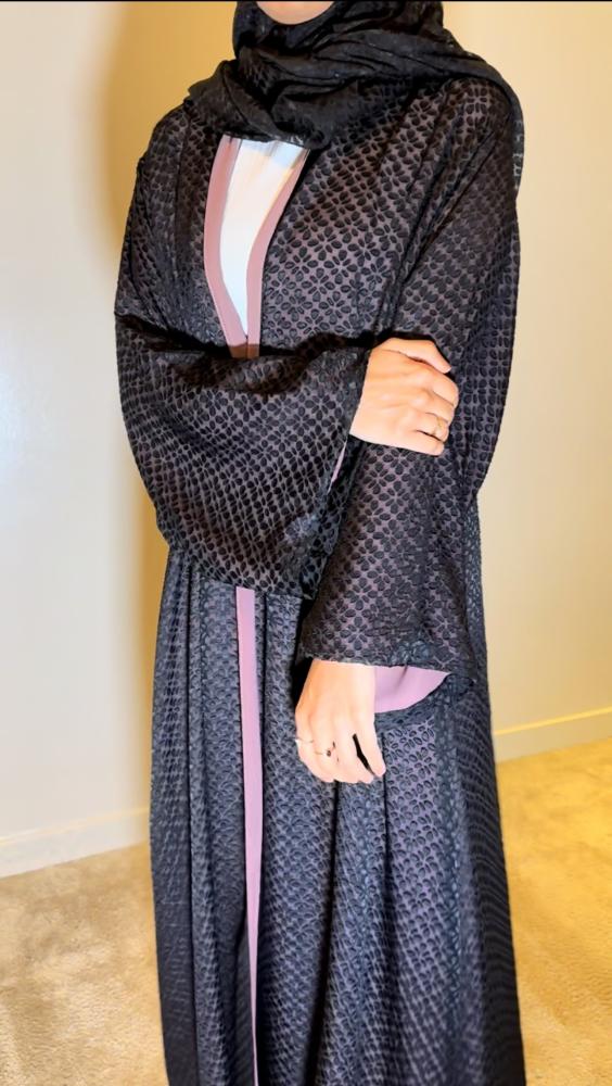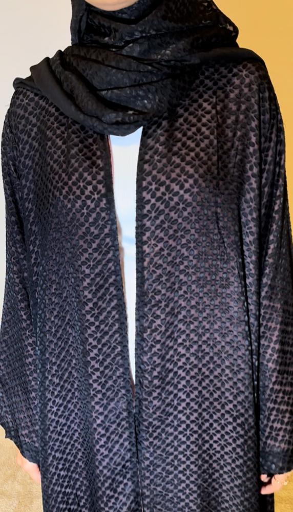 القماش : شيفون اوبل هندي اسود بنقش بارز وبطانة شيفون ليزر لحمي