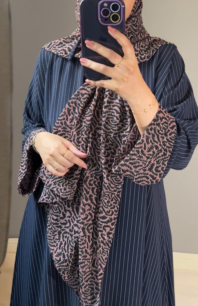 القماش: كريب كحلي مقلم الكريب خفيف وطايح مع طرف كم شيفون لحمي مشجر ، مبطنة العباية ليزر كحلي