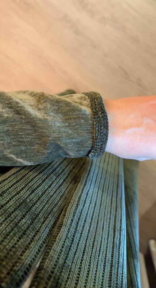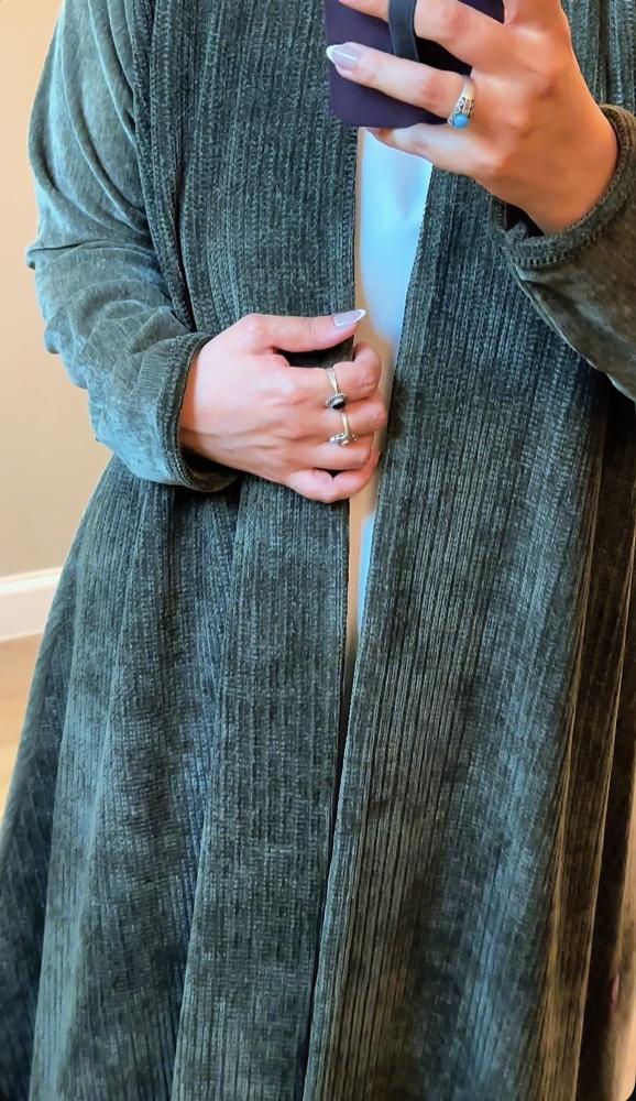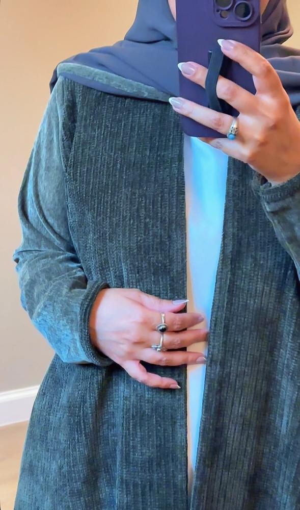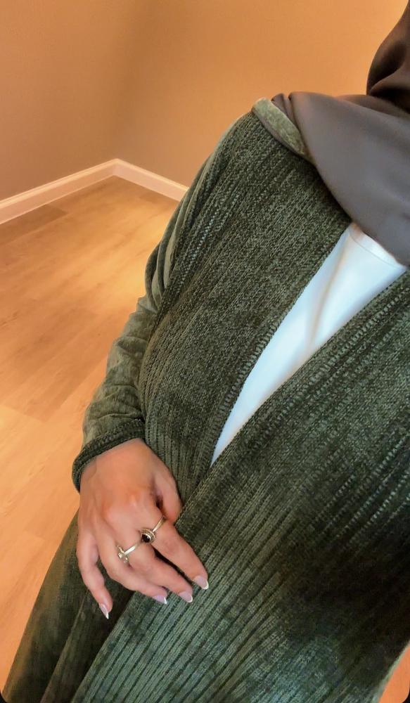 القماش: من الامام مخمل موهير مغزول ناعم وطايح باللون الزيتي والعباية من الخلف والاكمام مخمل زيتي ممتاز وجهين ( من الداخل نفس الخارج بدون ملمس البولستر ) الخامتين نغس درجة اللون