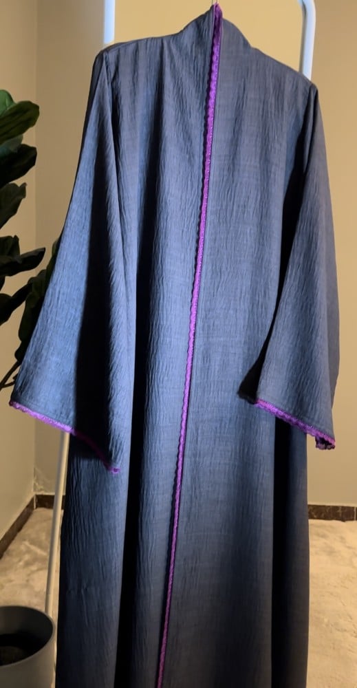 اللون المعروض : رمادي غامق ، اطراف العباية دانتيل فوشي غامق ( اللون في الحقيقة اغمق من اللون الظاهر بالصورة)