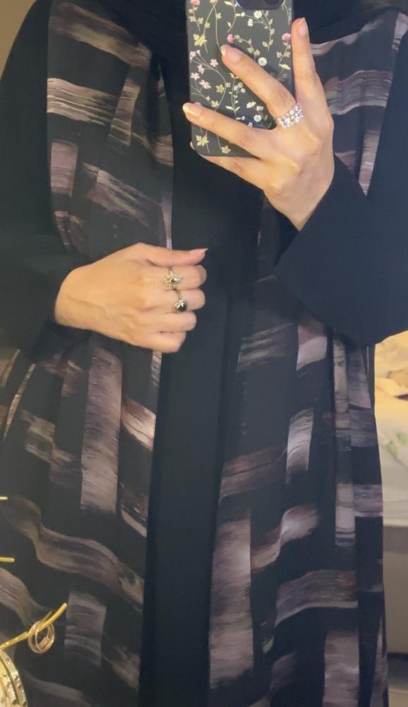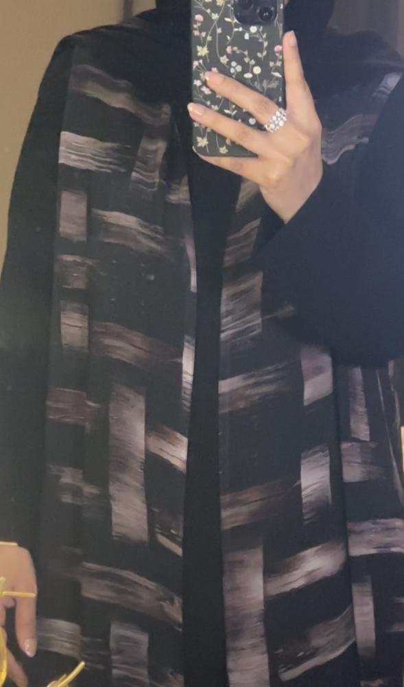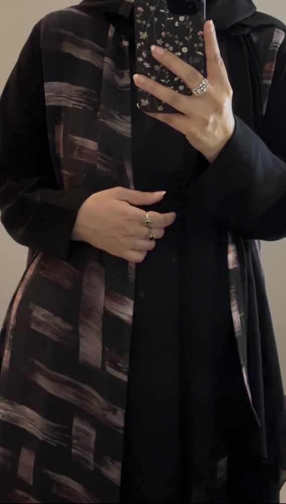 القماش : شيفون هندي اسود مشجر اكمام كريب سيراميك اسود مبطنة العباية ليزر