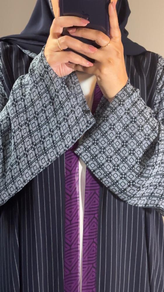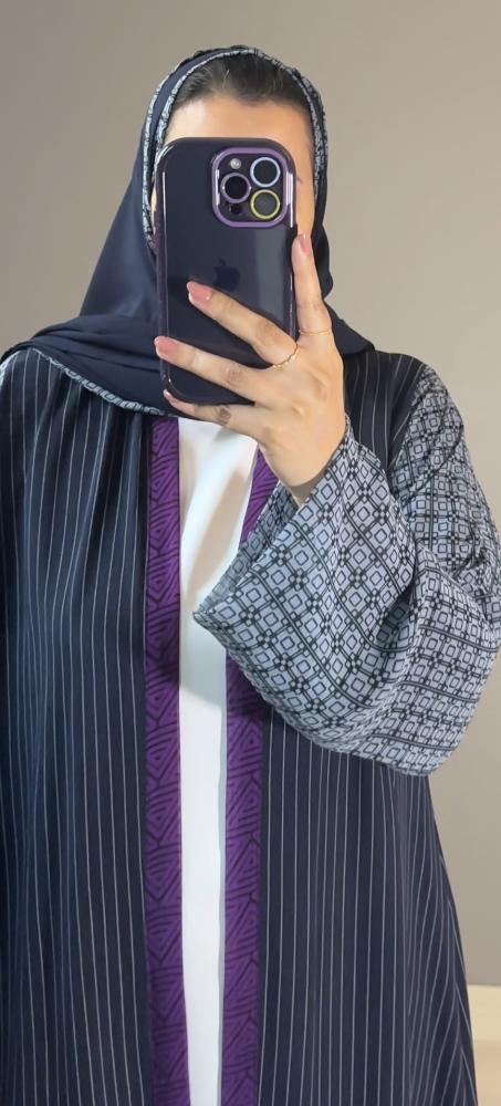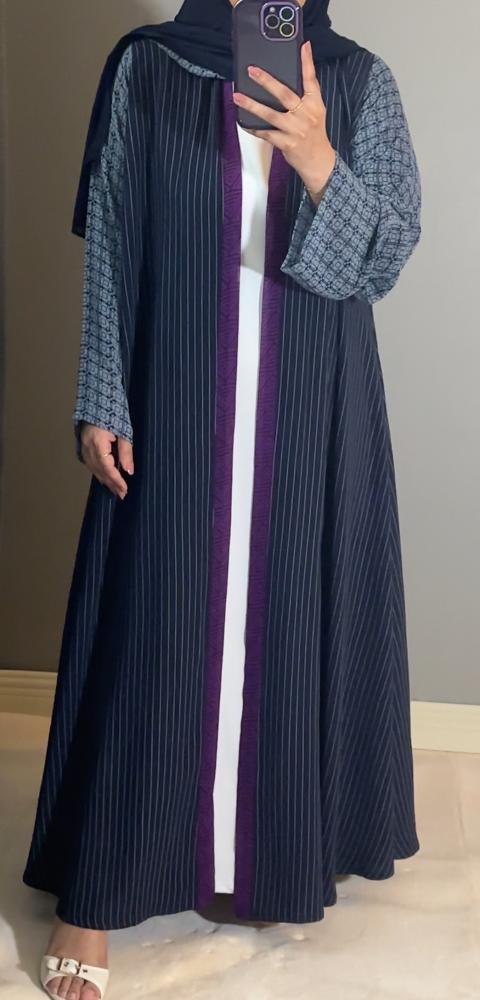 كريب كحلي مقلم خفيف وطايح مع اكمام شيفون وياقة شيفون
