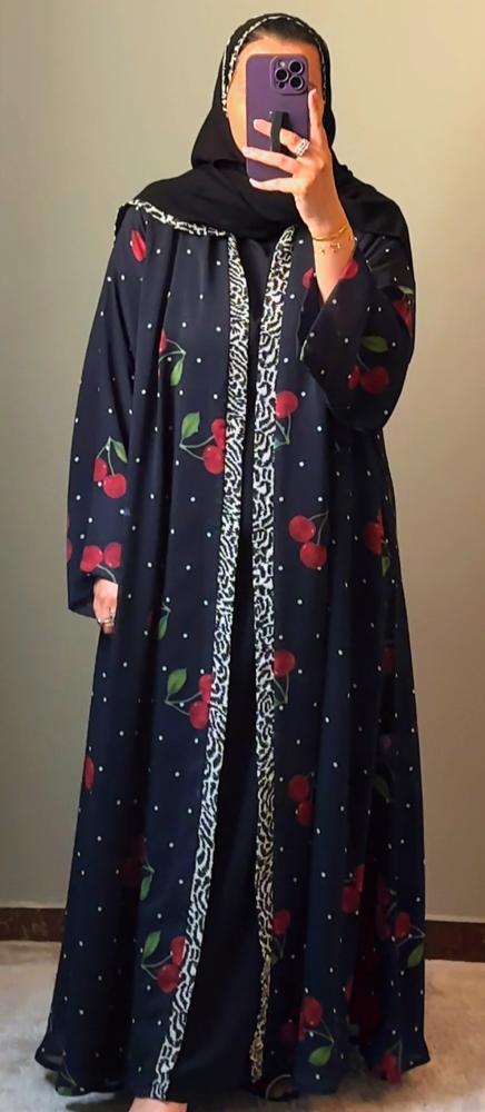 القماش : شيفون اسود برسم الكرز الشيفون خفيف وناعم ، مبطنة العباية ليزر اسود