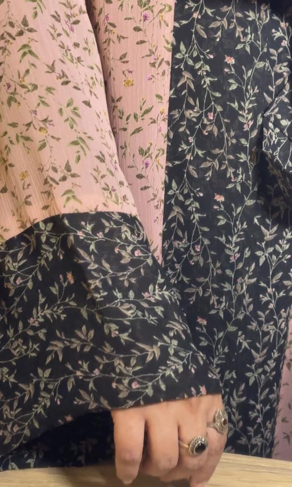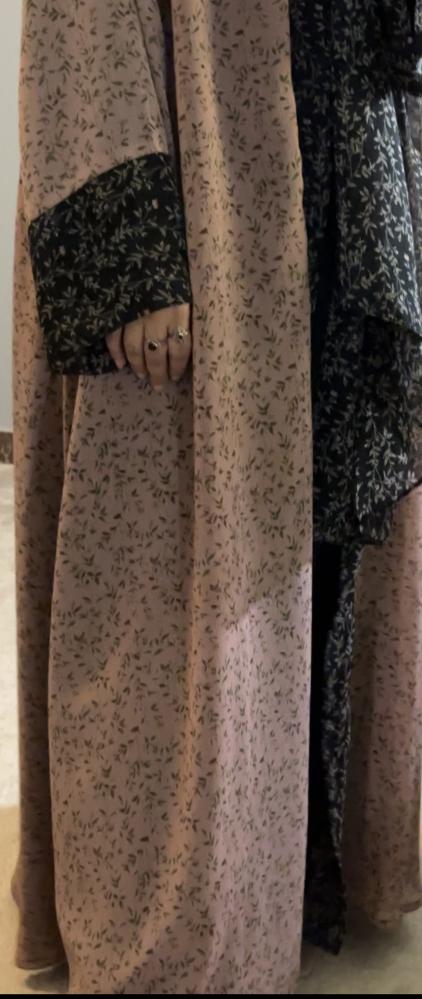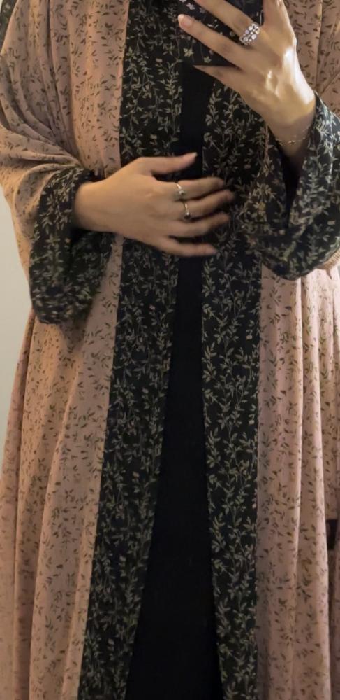 القماش : شيفون كوري وردي-لحمي مشجر مع ياقة وطرف كم اسود مشجر مبطنة العباية ليزر