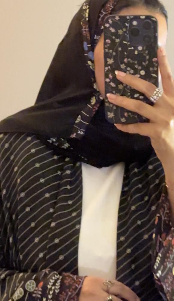 القماش : شيفون كوري اسود مقلم ابيض مع طرف كم مشجر مبطنة العباية ليزر